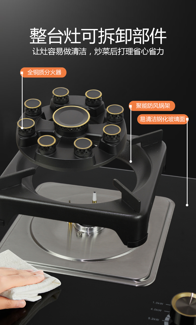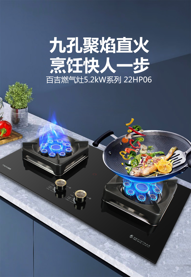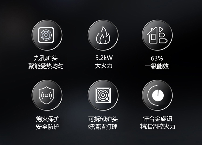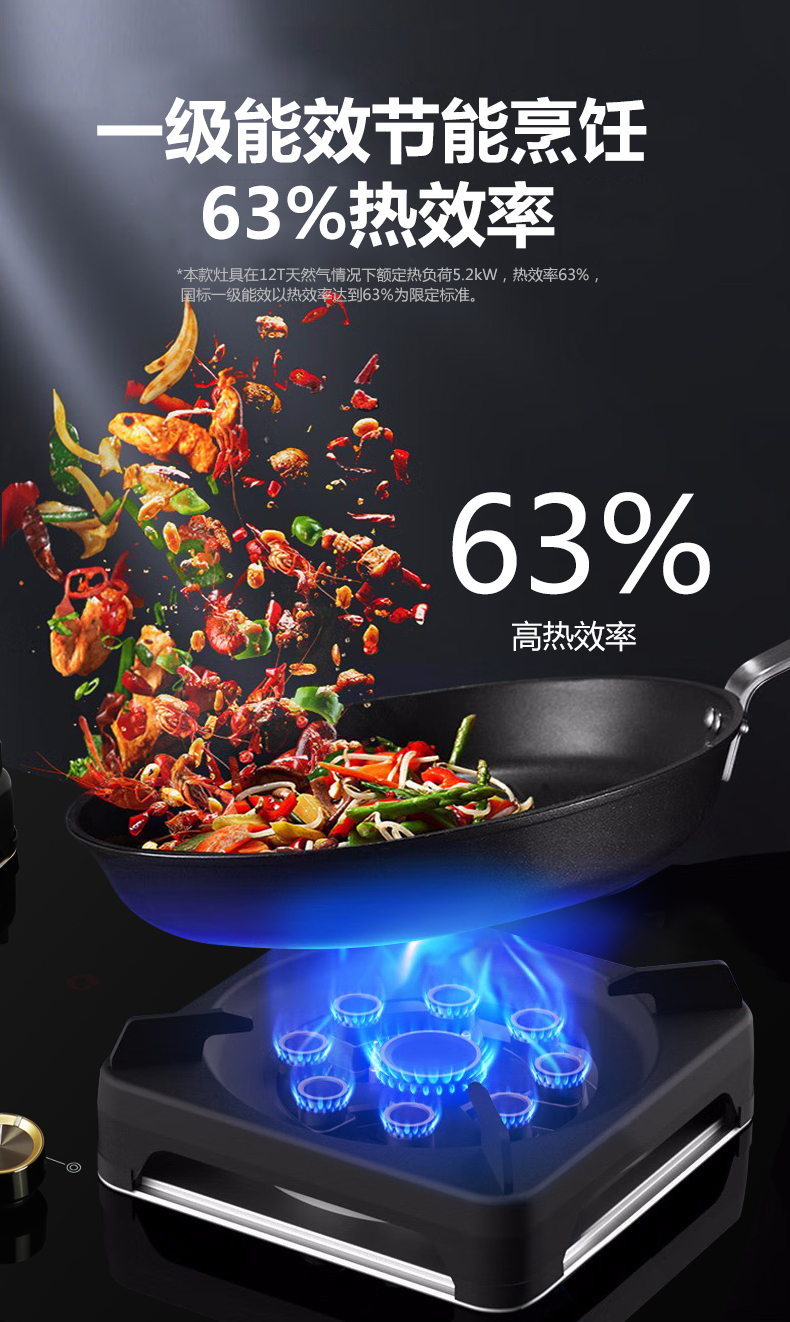 5.2kW聚能猛火灶,63%熱效率一級能效,帶熄火保護(hù)裝置